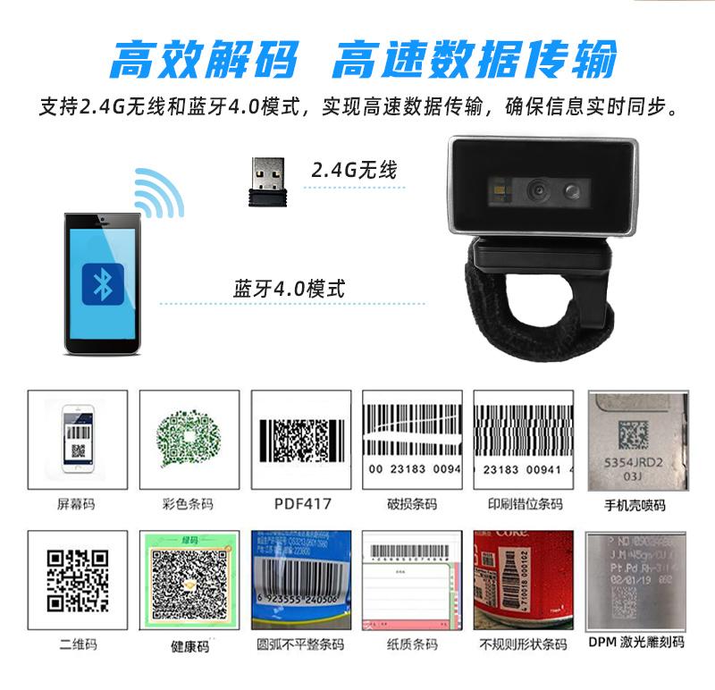 與傳統的手持掃描槍相比,XT3001BHD指環掃碼器具有許多優點。首先,由于其小巧輕便的設計,操作員可以輕松地將其戴在手指上,從而解放雙手,提高工作效率。其次,指環式掃描器具有無線傳輸功能,可以通過藍牙或者2.4G傳輸數據,避免了有線掃描槍布線的煩惱。